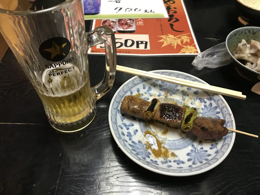 定番の焼き鳥、ればーが大きい!ビールはサッポロ。