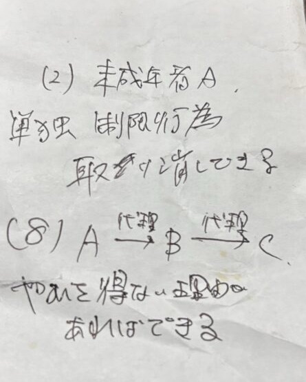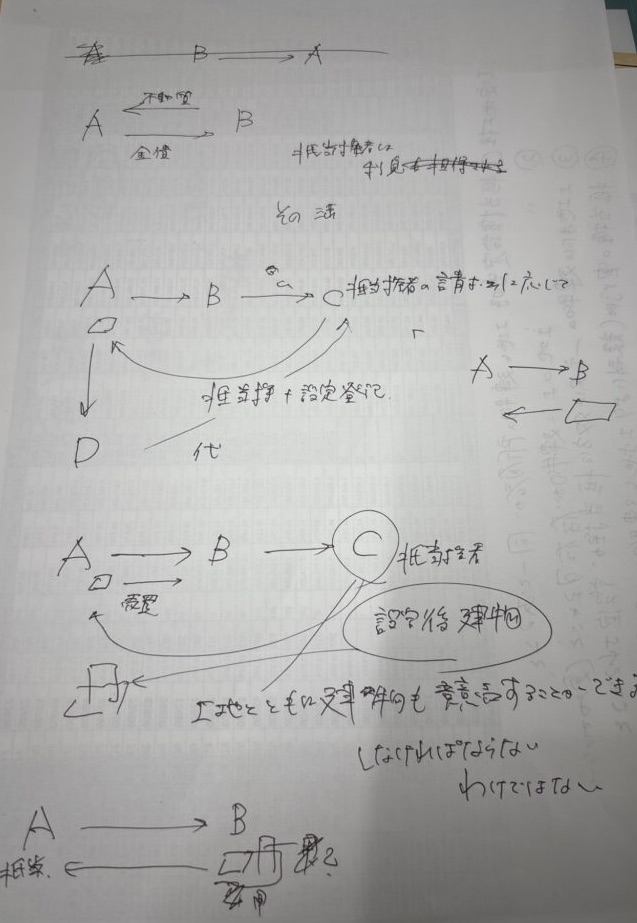 3 〇 判決文第1段落に、「所有者甲から乙が不動産を買い受け、その登記が未了の間に、丙が当該不動産を甲から二重に買い受け、更に丙から転得者丁が買い受けて登記を完了した場合に、たとい丙が背信×的悪意者に当たるとしても、丁は、乙に対する関係で丁自身が背信的悪意者と評価されるのでない限り、当該不動産の所有権取得をもって乙に対抗することができる」という記述がある。したがって、判決文によれば、「所有者甲から乙が不動産を買い受け、その登記が未了の間に、第二の譲受人(丙)が当該不動産を甲から二重に買い受け、更に丙から転得者丁が買い受けて登記を完了した場合に、たとい第二の譲受人(丙)が背信的悪意者に当たるとしても、転得者(丁)は、第一譲受人(乙)に対する関係で転得者(丁)自身が背信的悪意者と評価されるのでない限り、当該不動産の所有権取得をもって第一の譲受人(乙)に対抗することができる」ことになる。